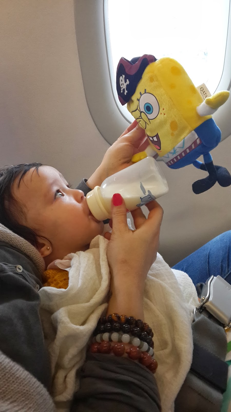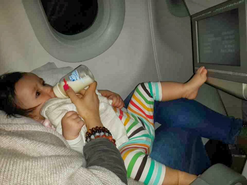 Éppen csak leültünk, amikor Szofi baba az éhen halás szélére keveredett egy perc alatt, amit hangos sírással adott a mi és utastársaink tudtára. A bekészített tápszerhez kértünk meleg vizet, így már felszállás előtt jól bekajált.