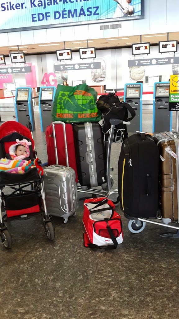 Amíg a hátizsák úton volt, addig becsekkoltunk. Apa javaslatára, Szofi babát kézbe vettem, hátha hatásos lesz túlsúly ellen, “ha Mária Teréziának bejött nekünk miért ne” alapon. Jó kis tervnek tűnt, de azzal nem számoltunk, hogy az ott dolgozó hölgy abszolút immunis volt a gyerekekre…gondoltam is, hogy ezt most jól megszívtuk. Megmértük a csomagokat, ekkor lepörgött az egész életem a szemem előtt, mert úgy nézett ki, hogy túlsúlyban vagyunk, de aztán kiderült, hogy mégsem. A hátizsákot, amikor megérkezett megmutattam. Gyors búcsú a családtól és mivel már így is késésben voltunk, azonnal be kellett mennünk. A babakocsit a gép ajtajáig vittük, ott össze kellett csuknunk, mert levitték a csomagtérbe.