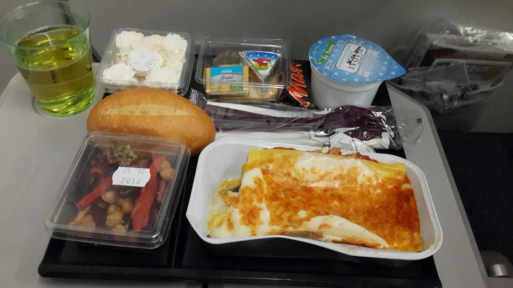 Szerencsénkre akkor is az ágyikóban szunyókált, amikor a vacsora megérkezett, így nyugodtan tudtunk enni. Háromféle ételből lehetett választani: gombás csirke/hal galuskával és spenótos lasagne. A mellé járó körítés mindenkinek ugyanaz volt: zsemle vajjal és sajttal, csicseriborsó saláta, csoki és valami habos desszert. Ha kértél még mellé kaphattál gyümölcslevet, szénsavas üdítőt, ásványvizet, bort vagy amit akartál.