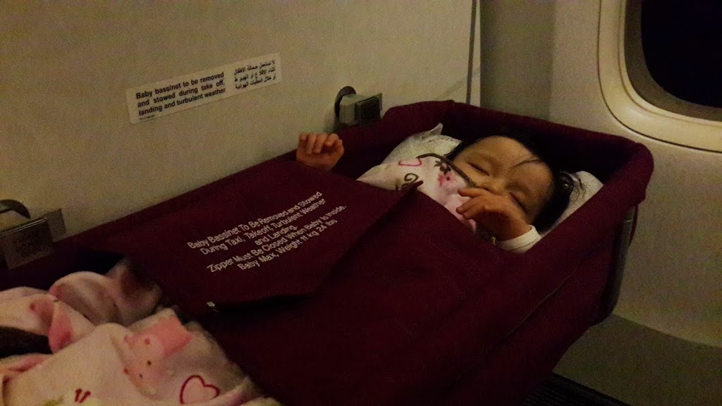 Az út Doháig 5 óra 45 perc volt. Szofi nem aludta végig az utat, hol engem, hol Apát szórakoztatta. Feltett lábbal mesét nézett, átleselkedett a szomszédokhoz, később pedig betrottyintott. Így történt, hogy felavattuk a repülőn a pelenkázó helyiséget. Az egyébként is kicsi mellékhelyiségben, a klotyó felett van egy lehajthatós pelenkázó, ami ugyan Szofinak nem tetszett, mindenesetre nagyon hasznosnak bizonyult.