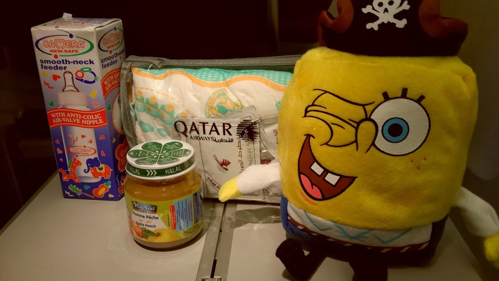 Felszállás után nem sokkal megérkezett végre az újabb Spongya Bob baba mellé a babacsomag is. Volt benne cumisüveg (szigorúan BPA free), egy kis csomag két pelenkával, néhány törlőkendővel, testápoló krémmel és hintőporral, illetve egy kis üveg püré. Kétféléből lehetett választani sárgarépa-burgonya vagy alma-barack, mi az utóbbira adtuk le a voksunkat.
