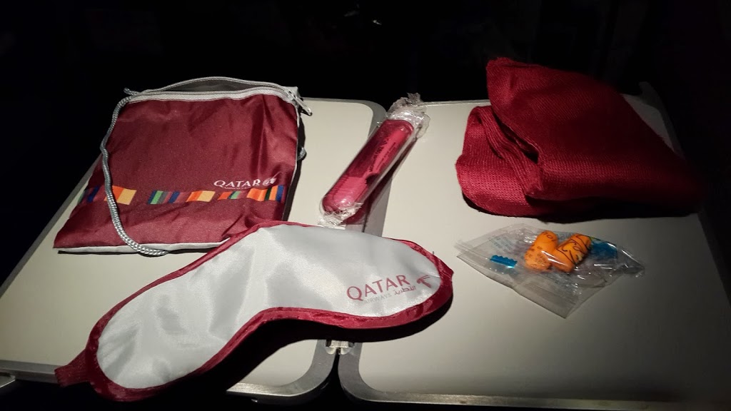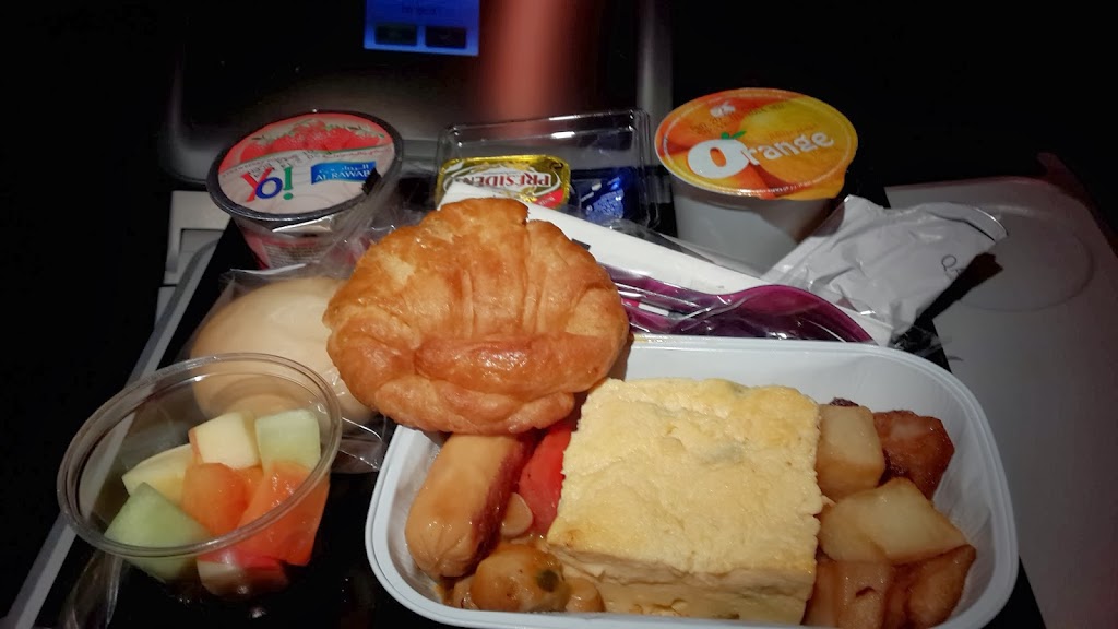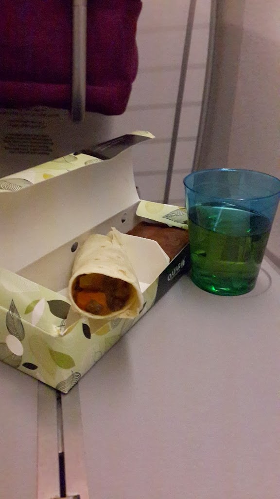 Amikor felszálltunk, még nem sokan akartak aludni, a villanyt se kapcsolták le azonnal. Körbementek a szokásos cukorka-frissítőkendővel, majd itallal kínálták az utasokat. Apa még mindig éhes volt, ugyanis Dohában végülis nem sikerült étkezni. Hoztak is gyorsan egy kis nassolnivalót. Kétféléből lehetett választani, egy húsos (csirkés) és egy vega tortilla közül. Én a vegát választottam, amit nem bántam meg, mert a mellé kapott süti nagyon finom volt, csokis-cseresnyés brownie, Apának a pipi tortilla mellé gyömbéres süti járt.