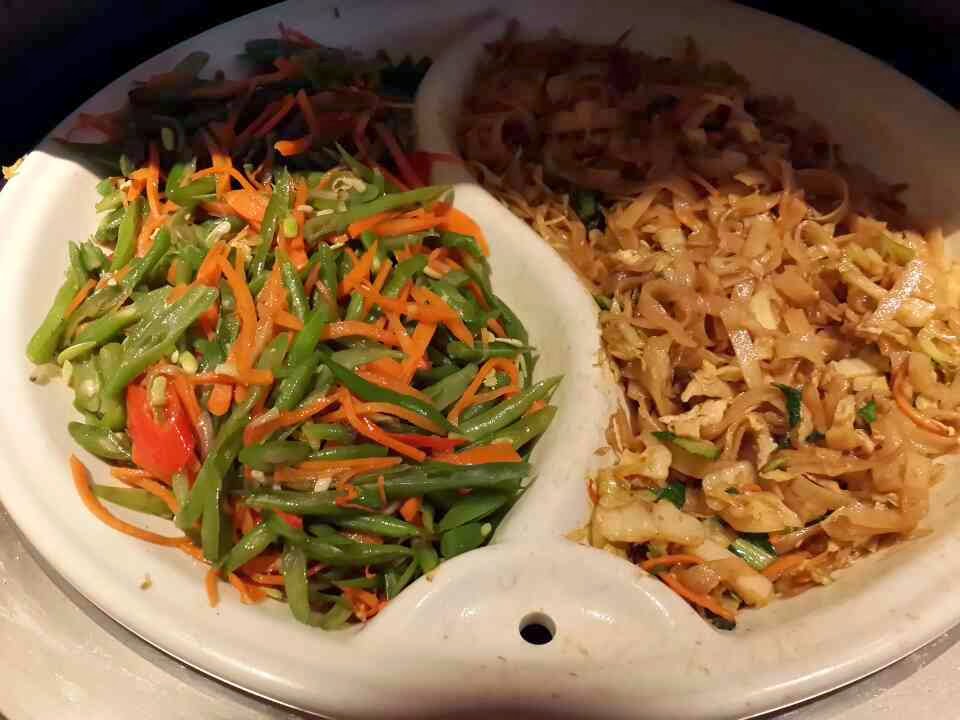 | Zöldbabos répás párolt zöldség, mellette sült tészta |