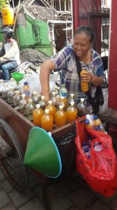 Már a bejáratnál megkezdődött a kavalkád. Egy kedves néni a tradícionális indonéz gyógyitalt árulta, ez a jamu (ejtsd: dzsámu). Meg is álltunk, mert Apa vett egy üveggel. Ezt az italt mindenféle gyógyfüvekből készítik. Az összetevői többek között a gyömbér, galangál gyökér, kurkuma, lime, ilang-ilang, jázmin, mindenféle levelek és magok…sokféle típusa ismert, gyógyhatása összetevőktől függően változó. Az indonéz emberek nagyon szeretik, sokakat gyógyított már ki különböző nyavalyáikból.