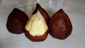 Kígyógyümölcsöt, vagy más néven szalakka gyümölcsöt. Kígyóra emlékeztető héja igazi csemegét rejt legbelül. A gyümölcs íze ananászos-epres, igazából meghatározhatatlan számomra, de nagyon ízletes.