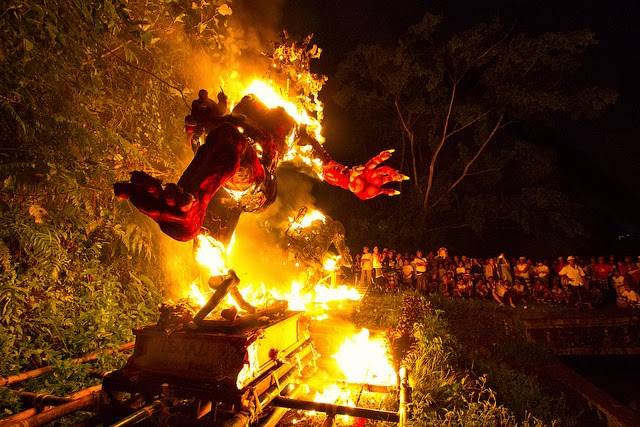 Már késő éjjel, az est fénypontjaként rituálisan elégetik az ogoh-ogoh-t, vele együtt pedig megsemmisítik a csapdába esett, benne lakozó gonoszt is.