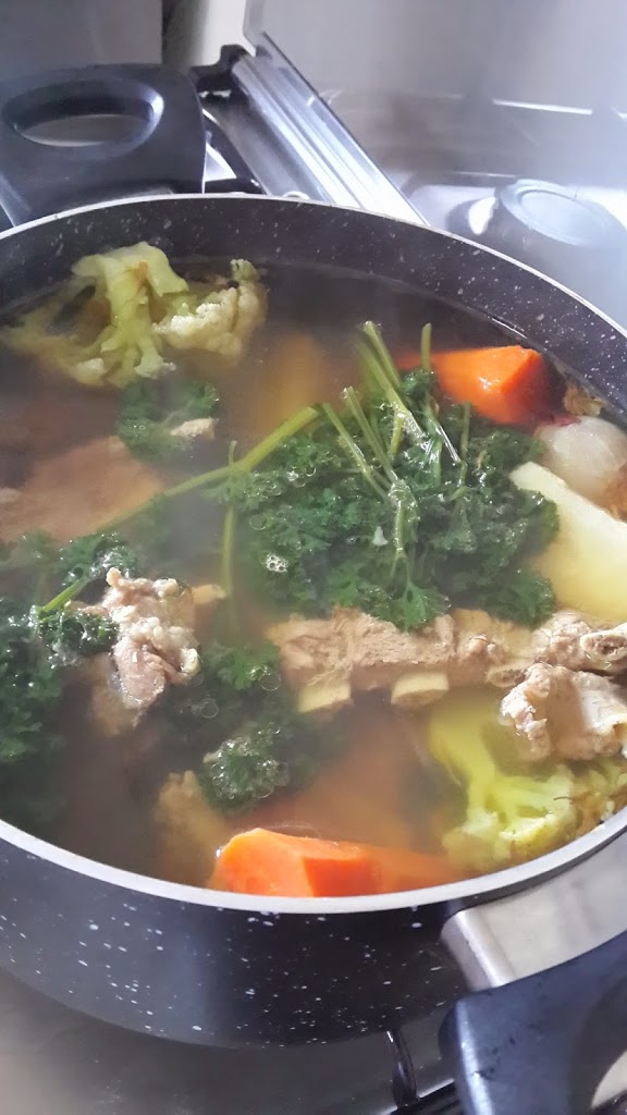 Ezek után jöttek a fűszerek…majorannna: sehol, de sehol nem volt a szupermarketben, úgyhogy ez most kimaradt a levesből, habár azóta már nagy örömömre sikerült beszereznem. Az otthon készített levesek elengedhetetlen ízesítője volt az a bizonyos “varázs”…bármennyire nem egészséges, ezért kerestem valami hasonlót. Van is szép számmal mindenféle por, úgyhogy leemeltem az egyiket és azt vettük meg. A főzés a szokásos módon ment, semmi extra nem volt benne husi a fazékban és hogy mit tartalmaz a levesízesítő…óóó…még szerencse, hogy elolvastam…elment az életkedvem is. Úgyhogy abból nem is került bele…azóta már ki is dobtam és a jó öreg fűszerek plusz só kombinációjából főzök istenibbnél istenibb leveseket. Feltettem a húsos csontot főni, majd miután felforrt és jó nagy hab keletkezett, leöntöttem róla a levet, lemostam a husikat és kicseréltem alatta a vizet. Szemes borssal, kurkumával, sáfránnyal és sóval ízesítettem és hagytam tovább főni. Végül a pucolt zöldségek is belekerültek ( a bengkuang-ot nem volt nagy cucc megpucolni, mintha zellert pucolnék, csak nem olyan göcsörtös a héja). Na és a végeredmény…nagyon finom lett csak azért hiányzott nekem a karalábé, mert én csak zöldséget eszek hússal, Apának meg a csigatészta…Ettől függetlenül mind “a tíz ujjunkat megnyaltuk” a hazai ebéd után.