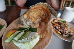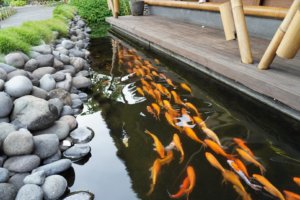 A tóban színes koi pontyok fickándoznak, a pincérek kérésre szívesen hoznak egy csomag haleledelt (5 ezer idr-100 ft). Felnőttek és gyerekek is szívesen etetik a halacskákat, amíg a megrendelt ételekre várakoznak.