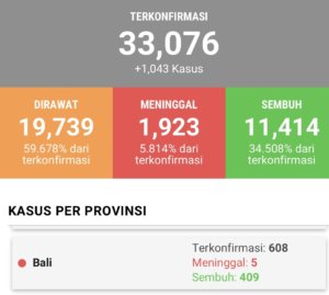 Jelenleg egész Indonéziában 33 ezer covid19 regisztrált fertőzött van, ezeknek közel fele szorul orvosi ellátásra, több, mint 11 ezren meggyógyultak, elhunytak száma: 1923. Az ellátó rendszert még extrán megterheli a sok szezonális dengue lázas beteg is.